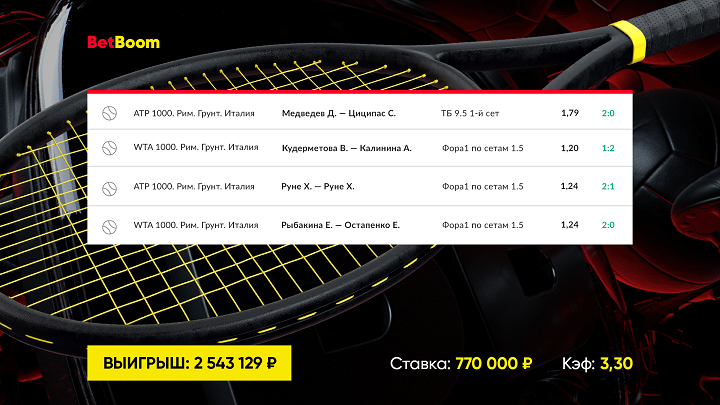 Экспресс на теннис принес клиенту БК BetBoom более 2 500 000 рублей!