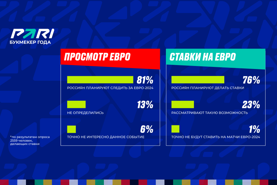 Опрос PARI прошли 2559 человек, которые делали ставки в последние три месяца. Результаты показали, что 81% ждут старта Евро-2024, 13% не определились и лишь 6% не интересуются событием. 76% планируют ставить на матчи, 23% рассматривают такую возможность, и только 1% откажется от ставок.