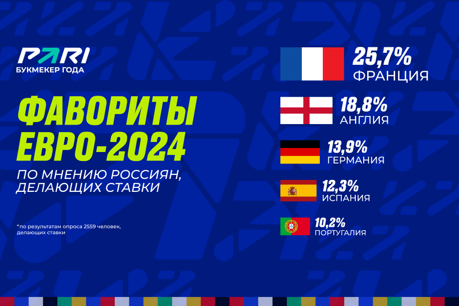 Среди фаворитов Евро-2024 россияне, которые делают ставки и интересуются спортом, выделили пять команд. Наибольшие шансы стать чемпионом Европы, по мнению 25,7% опрошенных, у сборной Франции. Следом идут Англия (18,8%), Германия (13,9%), Испания (12,3%) и Португалия (10,2%).