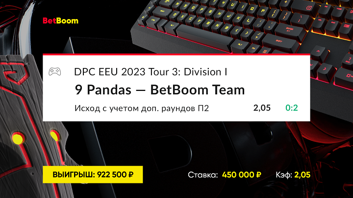 Игроки 9 Pandas на первой карте взяли рискованный пик и не смогли реализовать преимущество в ранней стадии игры. Состав BetBoom Team выиграл на первой карте без особых сложностей. После перерыва 9 Pandas на второй карте подарили сопернику необходимое преимущество, которым тот умело воспользовался. BB Team выиграли на второй карте за 22 минуты. В результате со счетом 2:0 победу одержали игроки BetBoom Team, а ставка беттора зашла.