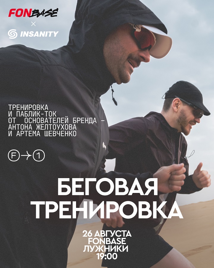 Основатели спортивного бренда Insanity Антон Желтоухов и Артём Шевченко проведут забег по Лужникам, а также расскажут о становлении и развитии бренда изнутри — на примере знаковых историй, лернингов и ярких эпизодов. На базе Антон и Артем разыграют среди гостей 30 футболок из линейки Performance, созданных совместно с FONBASE.