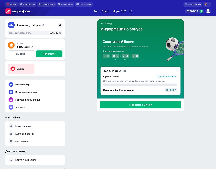 В рамках редизайна отдельное внимание уделено бонусам. Все предложения теперь собраны в одном разделе, а управление ими стало проще. Для активных бонусов добавлена шкала прогресса отыгрыша, позволяющая отслеживать выполнение условий. Также появился ввод промокодов, а следить за доступными предложениями и управлять ими стало проще.