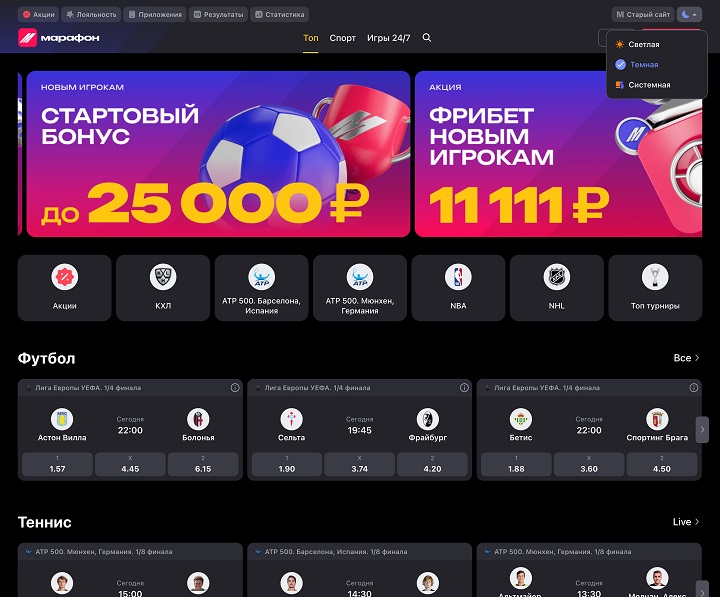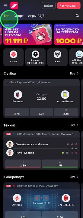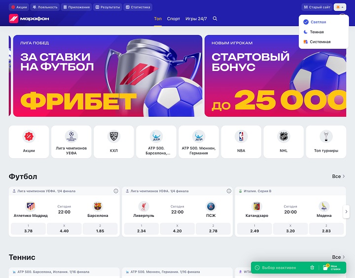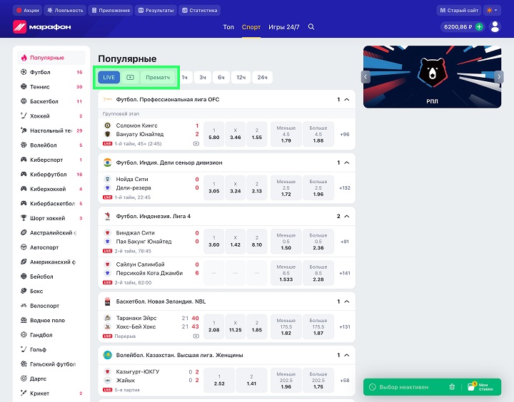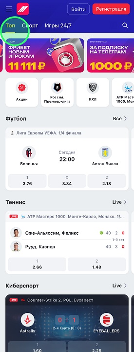 Изменилась главная страница сайта — добавилась страница «Топ» с актуальными акциями и спортивными событиями, подобранными под ваши предпочтения. Раздел Live больше не вынесен отдельно, теперь он интегрирован в каждый вид спорта и доступен через переключение между режимами Live и Прематч.