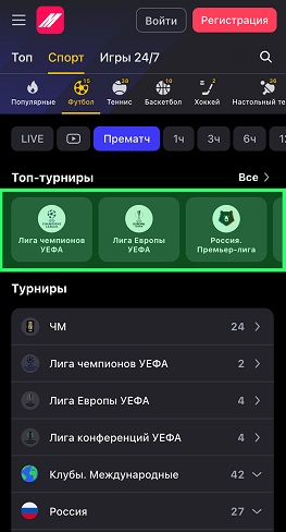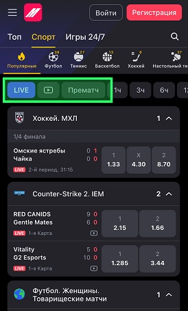 Навигация по спортивным событиям стала заметно проще. Матчи сгруппированы по видам спорта, а внутри разделов можно быстро переключаться между лайвом и предматчевыми событиями. Это помогает быстрее находить нужные матчи и оперативно переходить к размещению ставок. Старницу матча также обновили, а турниры находятся в отдельном разделе.