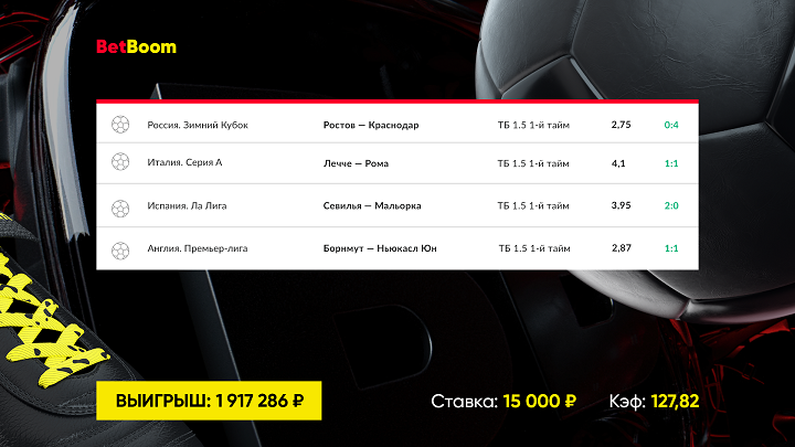 Субботний матчдэй запомнится клиенту BetBoom, собравшему экспресс из четырех матчей с одинаковой ставкой − ТБ 1.5 в первом тайме. Беттор зарядил 15 000 рублей на коэффициент 127.82 и выиграл1 917 286 рублей.
