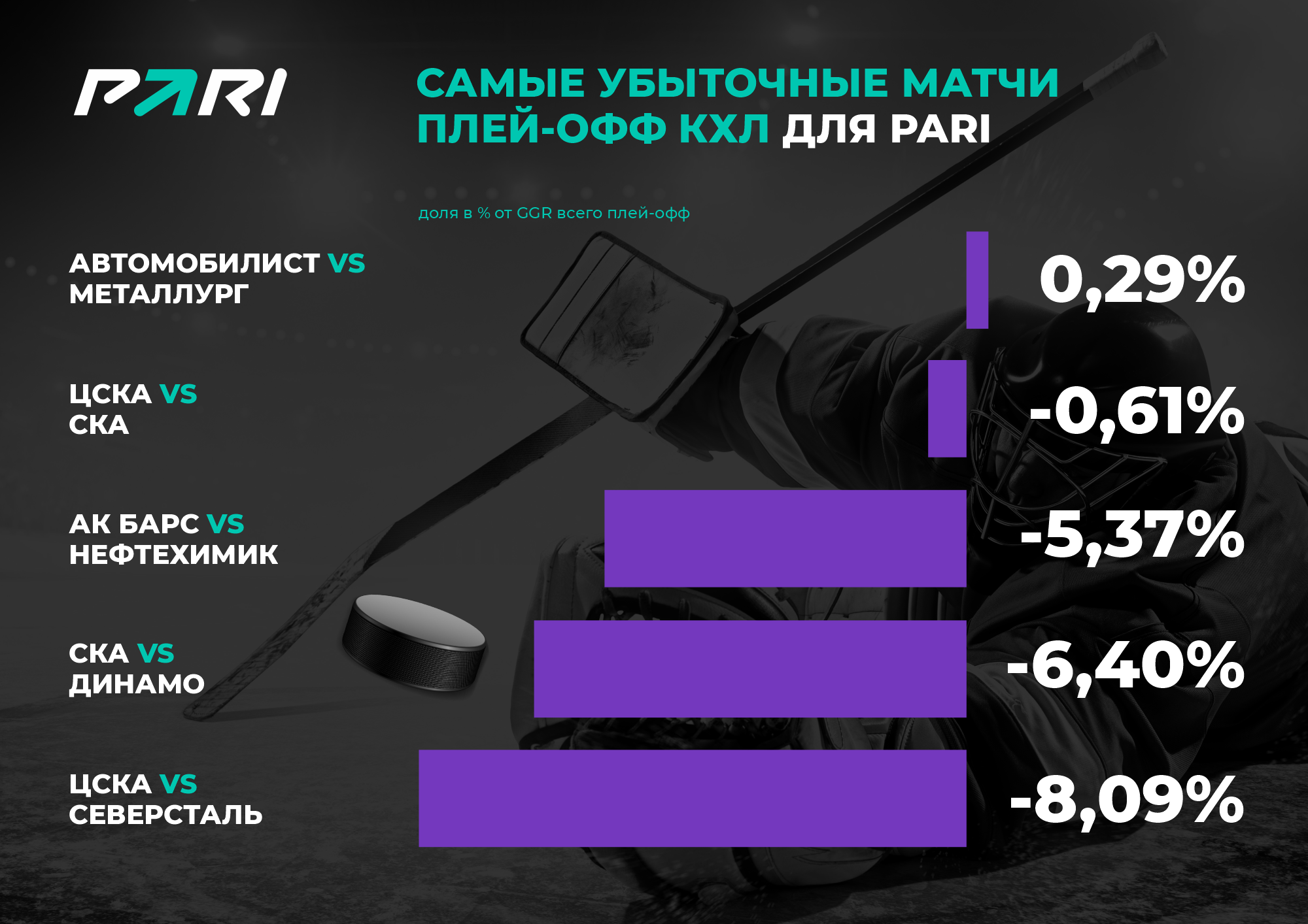 Самая убыточная серия для PARI — противостояние ЦСКА и «Северстали» в 1/8 финала.В топ-5 по убытку присутствуют следующие противостояния: СКА —– «Динамо Минск», «Ак Барс» — «Нефтехимик», ЦСКА — СКА и «Автомобилист» — «Металлург».
