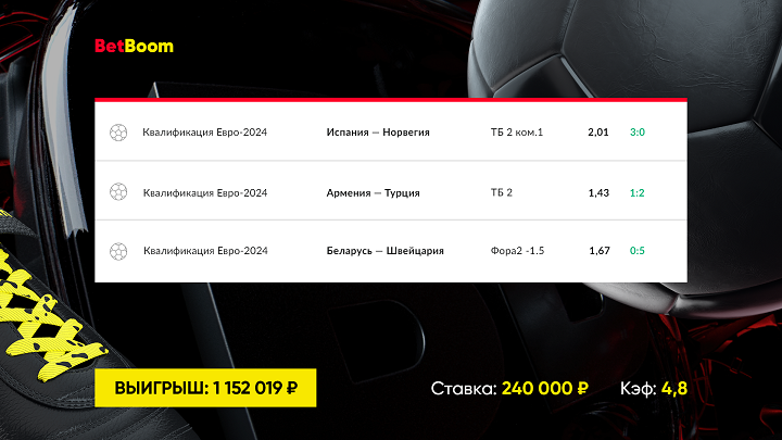 Клиент BetBoom собрал экспресс из трех матчей квалификации Евро-2024. Экспресс успешно доехал и беттор получил 1 152 019 рублей.