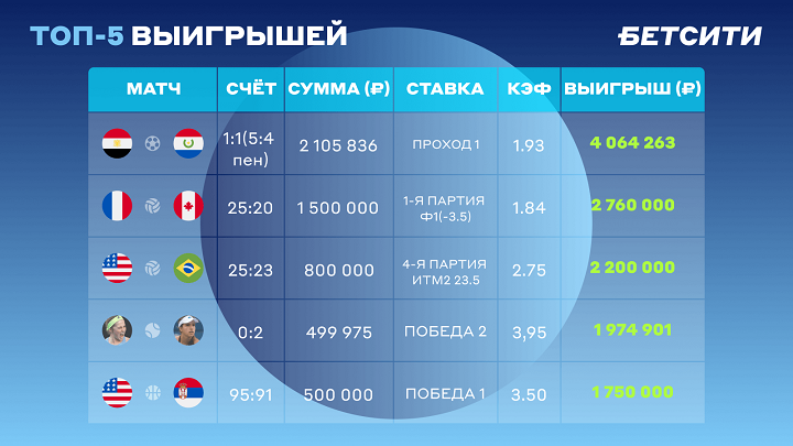 В топ-3 выигрышей вошли два события волейбольного турнира. Один из игроков БЕТСИТИ поставил на победу сборной Франции в первой партии в матче с Канадой. Ставка составила 1,5 млн рублей при коэффициенте 1.84. В результате клиент БЕТСИТИ получил более 2,7 млн рублей.