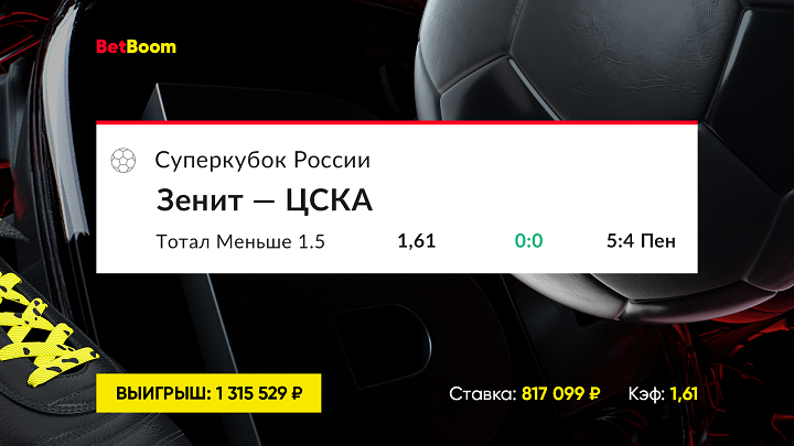Клиент BetBoom успешно предсказал исход матча: в основное время игра завершилась со счетом 0:0. Ставка беттора успешно зашла. Итог противостояния решился в серии пенальти, где сильнее оказался «Зенит» — 5:4.