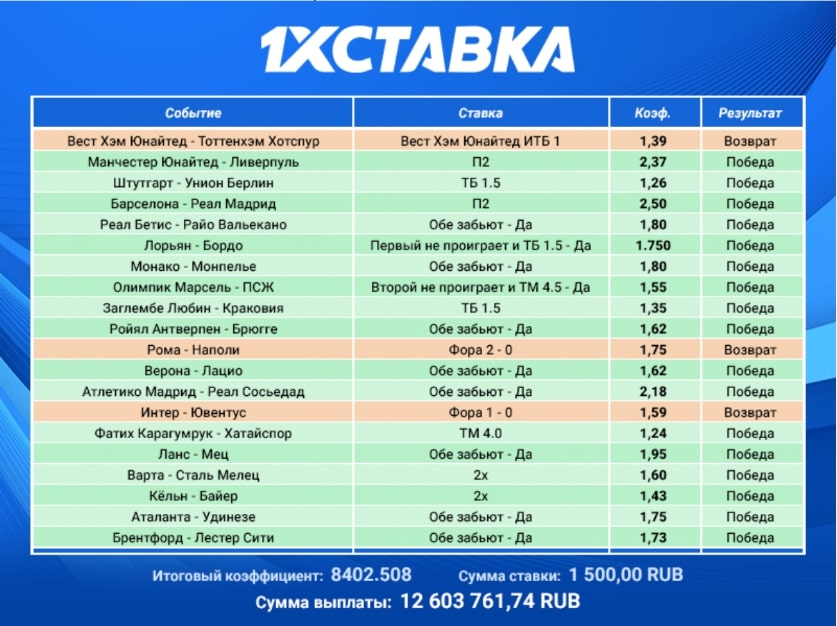 В этом экспрессе у игрока случилось 3 возврата - на домашних матчах “Вест Хэма”, “Ромы” и “Интера”, но и без этого итоговый выигрыш вышел максимально приятным, ведь сумма ставки составила 1500 рублей. Александр получит 12 603 761,74 рублей.