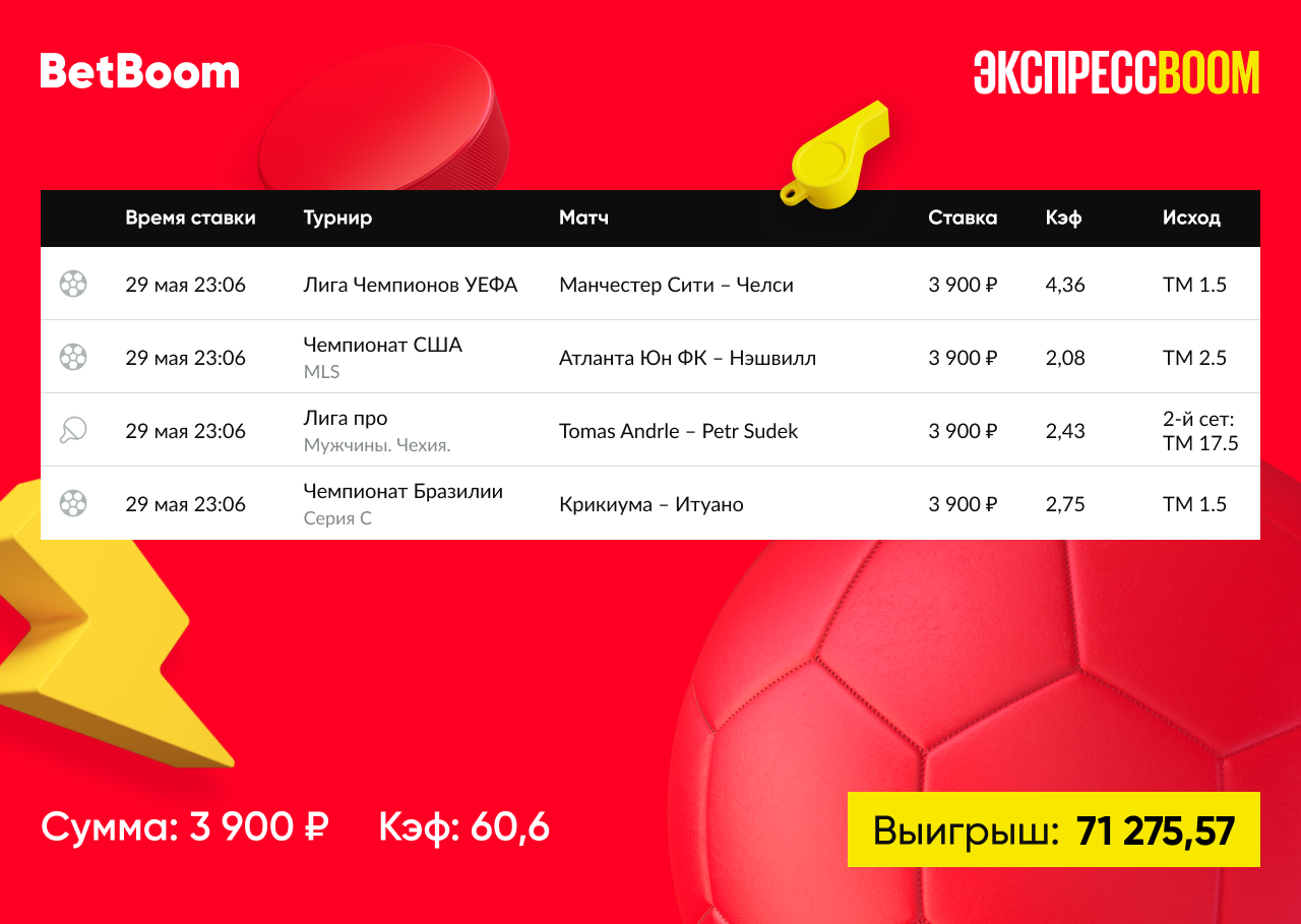 У клиента БК BetBoom сыграл экспресс с коэффициентом 60!