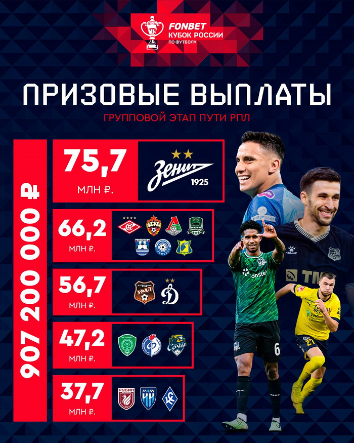 Одержавший пять побед в шести матчах группового этапа Пути РПЛ петербургский «Зенит» заработал 75,7 млн рублей. Московские «Спартак», ЦСКА и «Локомотив», а также «Краснодар», калининградская «Балтика», «Оренбург» и «Ростов» – получили по 66,2 млн рублей. Екатеринбургский «Урал» и московское «Динамо» – по 56,7 млн рублей; грозненский «Ахмат», воронежский «Факел» и «Сочи» – по 47,2 млн рублей; по 37,7 млн рублей получили казанский «Рубин», «Пари Нижний Новгород» и самарские «Крылья Советов».