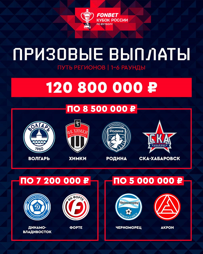 Клубы Пути Регионов получили в сумме 120,8 млн рублей. Самые крупные призовые по 8,2 млн рублей получили астраханский «Волгарь», подмосковные «Химки», московская «Родина» и «СКА-Хабаровск». Эти клубы продолжат выступление в плей-офф нижней сетки FONBET Кубка России.