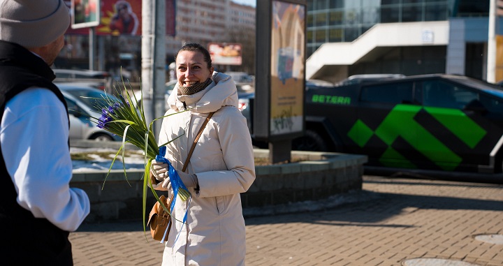 Белорусок радовали на Немиге, Раковском предместье, улице Карла Маркса, возле железнодорожного вокзала и даже на Комаровском рынке. Никаких сложных механик не придумывали — главной целью было подарить букет, поздравить с праздником и увидеть, как девушки идут дальше по делам с уже совершенно другим настроением.