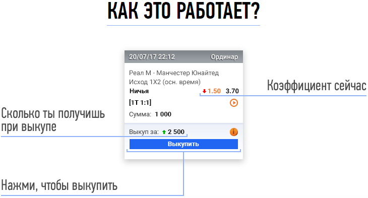 Опция "Выкуп ставки" позволяет Вам вернуть деньги на Ваш счет, зафиксировав прибыль или убыток как до игры, так и во время матча (Live). Если Вы сделали ставку (1х2 или любую другую) и передумали еще до игры, то в зависимости от изменения коэффициента, Вы вернете ставку, или ее часть, или ставку + прибыль на свой счет.
