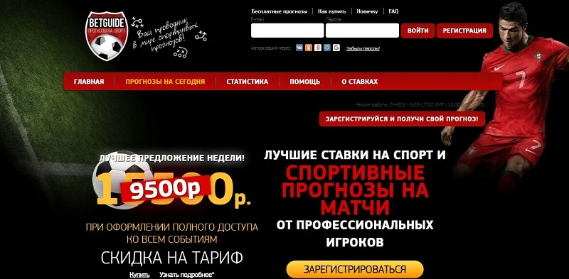 Сайт http://betguide.ru/ оформлен в характерном стиле для площадок, продающие платные прогнозы. На приветственной странице опубликованы предложения о сотрудничестве с подробным описанием.