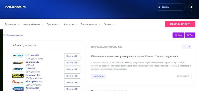 Спортивно-информационный портал BetUnion24.ru предоставляет объективную информацию о ставках на спорт, прогнозах, букмекерских конторах. Ежемесячно проводит конкурсы капперов с внушительными денежными призами. Основан командой профессионалов в 2011 году как статейный сайт, а с 2015 специализирующийся на беттинге.
