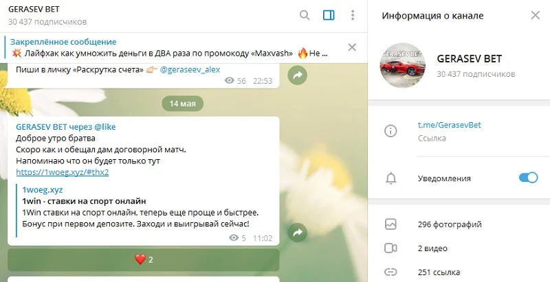 На канале ведется активное продвижение букмекерской конторы, в которой администратор призывает регистрироваться участников по реферальной ссылке. Каждый в день в чате анонсируются марафоны типа «лесенка», в которых псевдо-эксперт обещает умножить банк в 10 – 20 раз за несколько часов.
