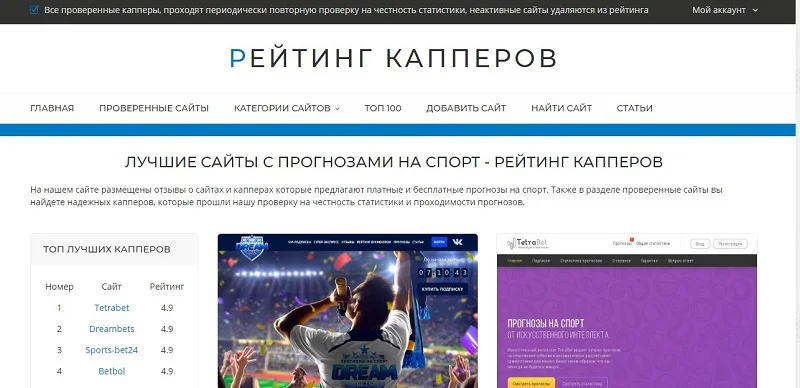 По центру приветственной страницы опубликованы ссылки на обзоры популярных капперов, а в левой стороне находится краткий топ лучших сервисов с выставленными оценками. Ниже опубликованы последние отзывы пользователей на сайте.