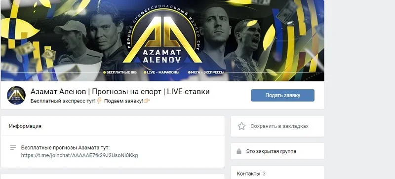 Азамат Аленов обещает своим клиентам стремительное увеличение банка, если они будут ставить по его платным прогнозам. При этом, каппер не стесняется выдвигать совсем не демократичные цены на свои услуги. К примеру, оформить VIP-подписку предлагается за 10 тысяч рублей.