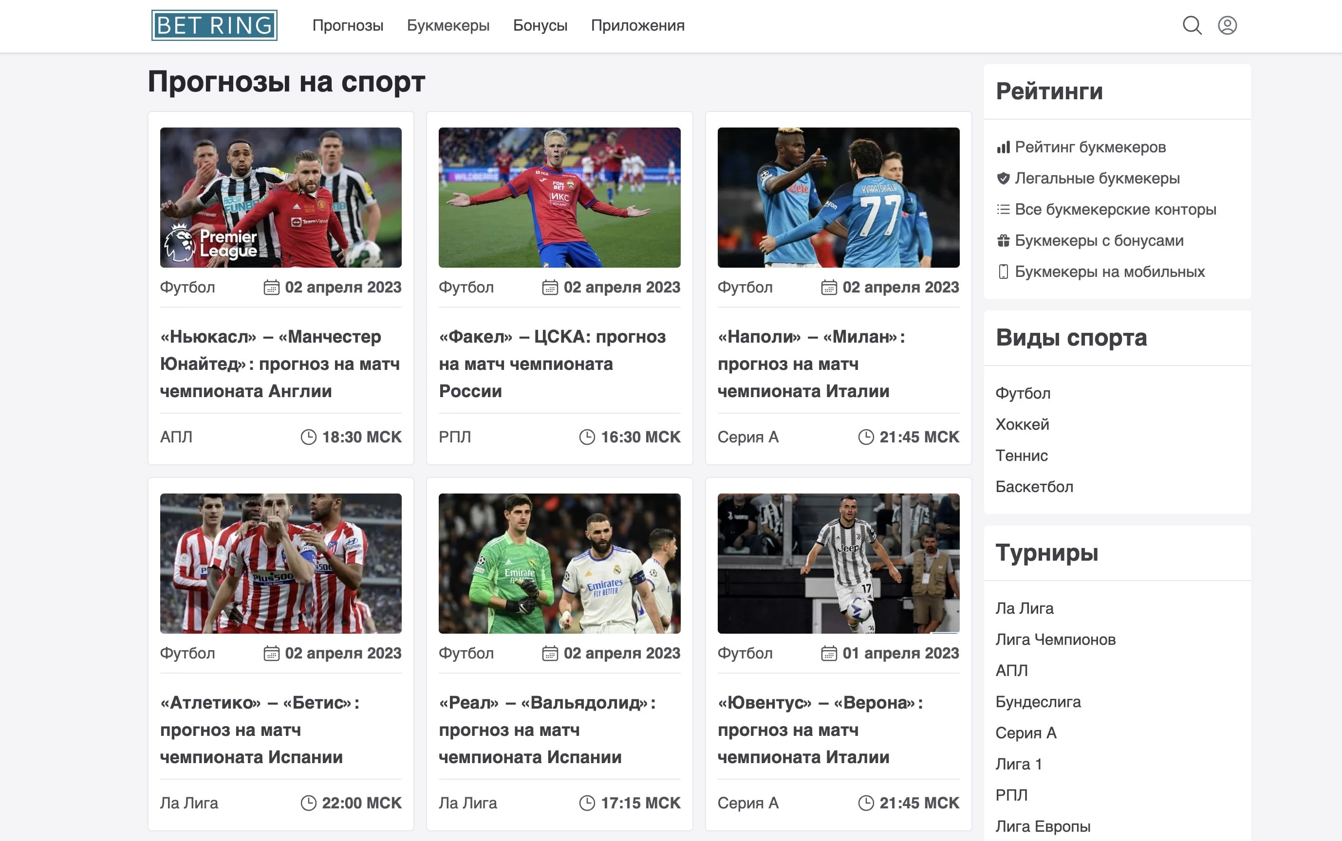 Все прогнозы на сайте BET-RING публикуются в открытом доступе – бесплатно. Предлагаются рекомендации по ставкам на три вида спорта: