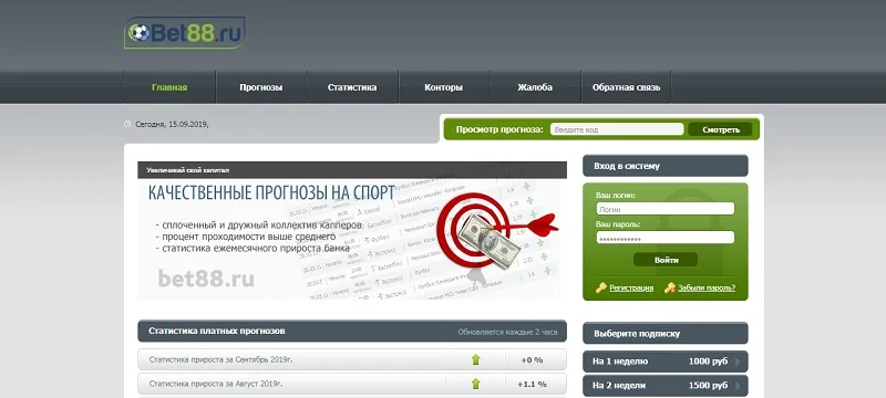 Bet88 предлагает четыре вида подписки на платные прогнозы. Цена недельного пакета стоит 1000 рублей, две недели – 1500, месячная подписка – 3000, два месяца – 4999.