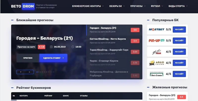 Посетив сайт betodrom.ru, нельзя не обратить внимания на непривычный рейтинг букмекерских контор. Лидирующие позиции в рейтинге занимают беттинговые сервисы Mostbet, Pin-up, Zigzagssport и Argo Casino. Лидеры отечественного беттинга, такие как, Лига Ставок, Winline, Betcity и Париматч, расположились за первой четверкой рейтинга.