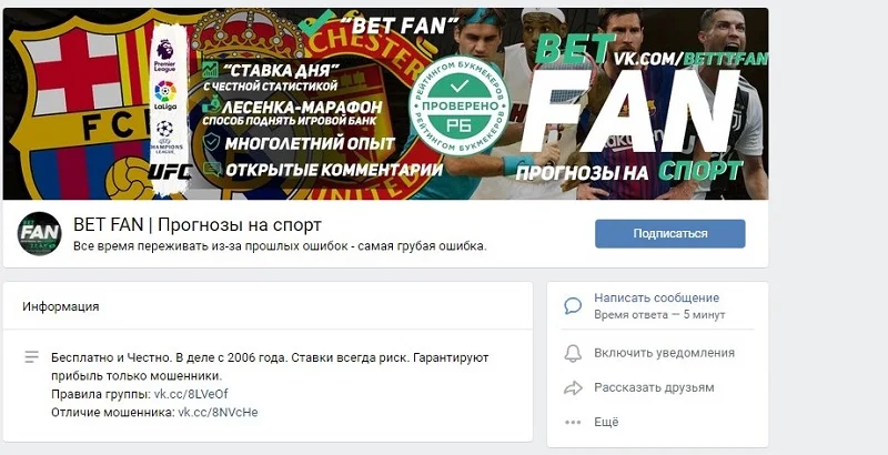 Сообщество BET FAN в социальной сети Вконтакте в момент написания обзора собрало почти четыре тысячи подписчиков. На стене группы ежедневно публикуются бесплатные прогнозы на матчи live, которые каппер подкрепляет скриншотами сделанных ставок.