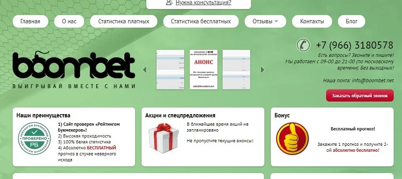 Позитивные отзывы в большинстве случаев связаны с бесплатными прогнозами от Boombet. Комментариев благодарных игроков, которые воспользовались платными пакетами сервиса, очень мало.