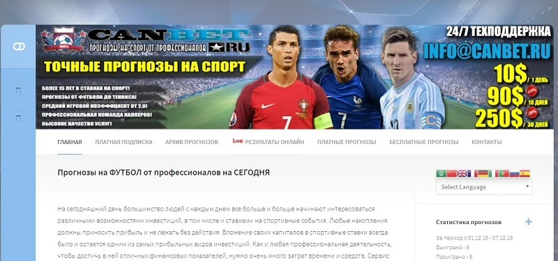 Каппер CANBET никак не подтверждает профессионализм, о котором он пишет на своем сайте. У сервиса нет регулярных бесплатных прогнозов, которые могли бы подтвердить компетентность его сотрудников.