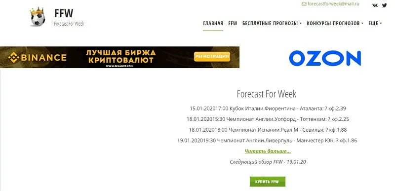 Кроме платных прогнозов с других ресурсов, FFW предлагает на бесплатной основе собственные рекомендации по ставкам. Каппер ориентирован исключительно на футбольные матчи ведущих европейских турниров.