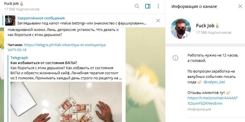 Актуальный канал Юрия Бойцова в Телеграмм носит название Fuck Job. Таким образом, создатель сервиса намекает на то, что его клиентам не приходится утруждаться на повседневных работах. Достаточно вложиться в его проект, и потом стабильно черпать от туда заработок.