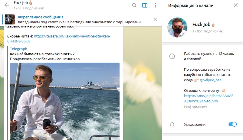Помимо работы в телеграме Fuck Job представлен в Instagram. Общее количество подписчиков составляет 94 000 человек. На постах можно увидеть самые различные проявления красивой жизни – привлекательные автомобили и отдых на курортах. В телеграм канале 17 000 подписчиков. Администратором является некий Николай Валуев. Несложно догадаться, что это фейк.