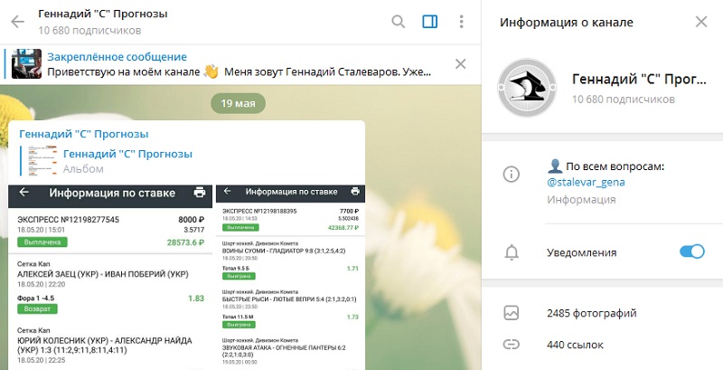 Общее количество подписчиков данного канала превысило 13 000 человек. Активность у пользователей хорошая. Администратором канала является некий Геннадий, который выкладывает бесплатные прогнозы с небольшими коэффициентами. Приятно, что в его канале присутствует пост, в котором он предупреждает о том, что нужно избегать сотрудничество с сервисами, специализирующимися на договорных матчах и прочих мошеннических действиях.