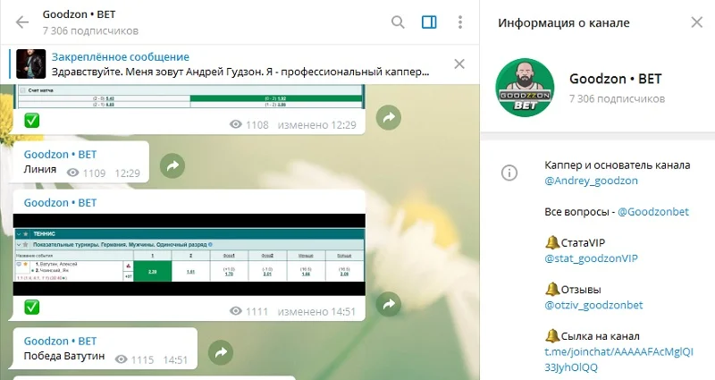 Представляемый канал каппера служит для трансляции бесплатных прогнозов, которые должны подвигнуть потенциального клиента на вступления в VIP-клуб Андрея. В среднем на канале ежедневно публикуется девять постов, из которых 3 – 4 бесплатные советы по ставкам на теннисные матчи в режиме live.