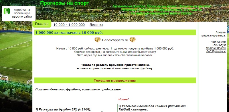 На текущий момент времени крайне тяжело отыскать отзывы о сайте. Сразу же после начала работы на ресурсе качество прогнозов было неудовлетворительным, что сказалось на том, что Handicappers.ru потерял практически всех своих новых клиентов.
