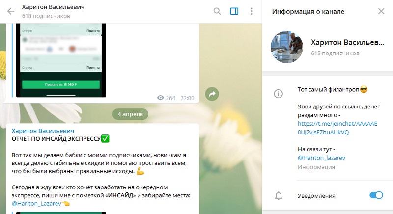 Сейчас на канале Харитон Васильевич рекламируют только платные услуги. Подписчикам видна реклама партнерской программы букмекерской конторы. Проблема в том, что Лазарев зависит от проигрышей приведенных клиентов, поэтому давать выигрышные прогнозы ему попросту не выгодно.