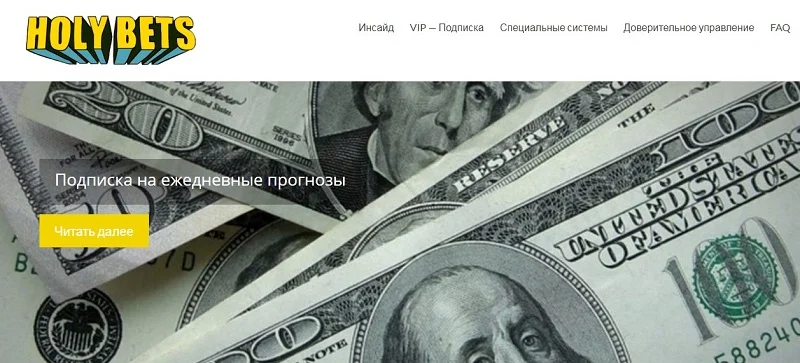 Доверительное управление – классический вариант сотрудничества для многих сайтов. HolyBets принимает самые различные счета с балансом от 10 000 рублей и обещает делить прибыль с его владельцем 50 на 50.