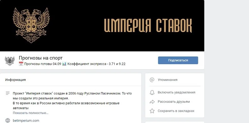 Группа Империя Ставок во Вконтакте собрала больше 90 тысяч подписчиков. Есть основания полагать, что большая часть пользователей привлечена искусственным путем.