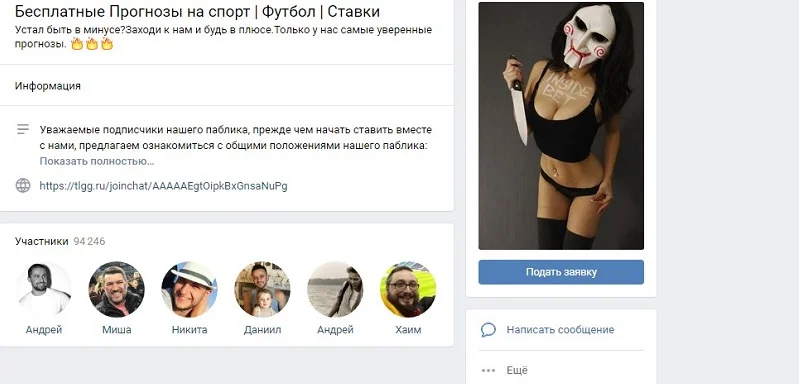 В группе каппер призывает пользователей подписываться на платную рассылку через Телеграмм. Также присутствует реферальная ссылка на регистрацию в букмекерской конторе 1хБет – заработок на проигрышах своих клиентов.