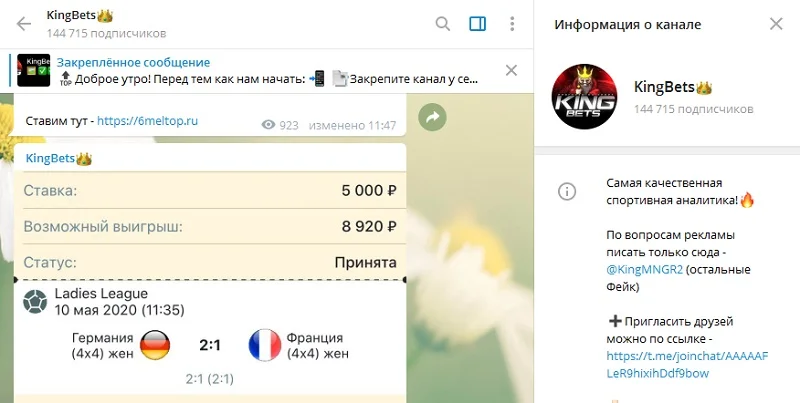 Сегодня мы рассмотрим работу канала KingBets, чтобы разобраться, достоин ли данный сервис внимания игроков, желающих получать прибыль с игры в букмекерской конторе.