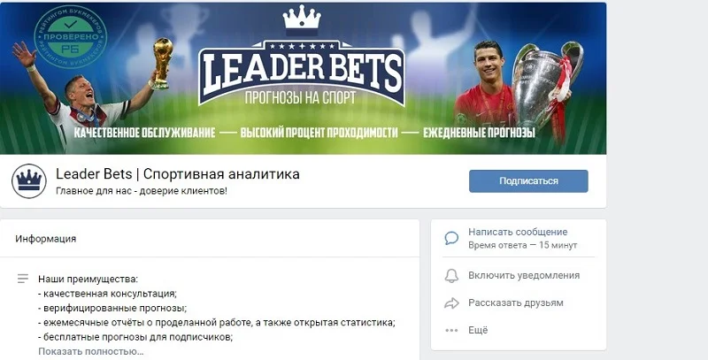 Группу Leader Bets в социальной сети Вконтакте можно посетить без ограничений. В момент написания обзора количество подписчиков паблика достигло 6 900 человек.