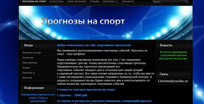 Для ведения диалога с администрацией компании предлагается использовать адрес электронной почты. Прочий контент о ставках на спорт на ресурсе отсутствует.