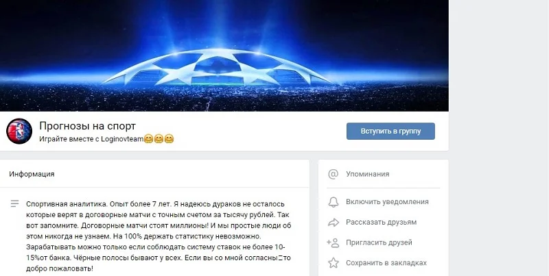 Сообщество Loginovteam во Вконтакте встречает посетителей вышеупомянутым сообщением. На группу каппера подписалось 19 тысяч человек. Увы, большая часть из них накрученные боты – аналогичные «мертвые» аккаунты заявлены и в других пабликах данного сегмента. Комментарии в группе закрыты, что наводит на мысль о том, что Логинов не готов вести открытий диалог со своими клиентами.