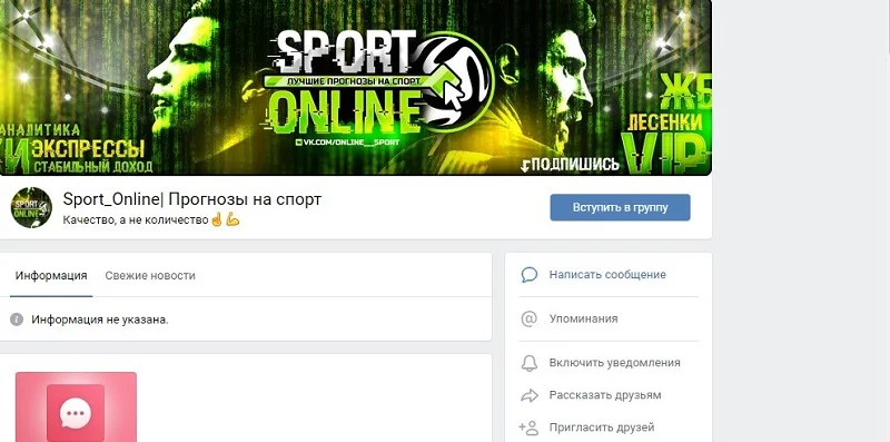 Сообщество Sport_Online в социальной сети Вконтакте собрало 35 тысяч подписчиков. Пользователям запрещено оставлять комментарии в группе, что сразу должно насторожить игрока, который намеревается воспользоваться услугами прогнозиста.