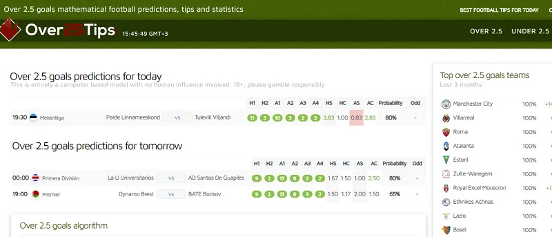На главной странице ресурса представлено обилие футбольных поединков. В процентном соотношении будут указаны итоговые шансы на три исхода: ОЗ, ТБ и ТМ. Все расчеты были произведены на основании статистических данных. Модель сайта Over25tips.com работает без участия человека, что исключает возможность ошибки. Для расчетов используется система Тони Робинсона. Никто на сайте не гарантирует прибыль на дистанции при следовании прогнозов. Для учета ставки ОЗ используется показатели последних 10 поединков. Все услуги предоставляются абсолютно бесплатно.