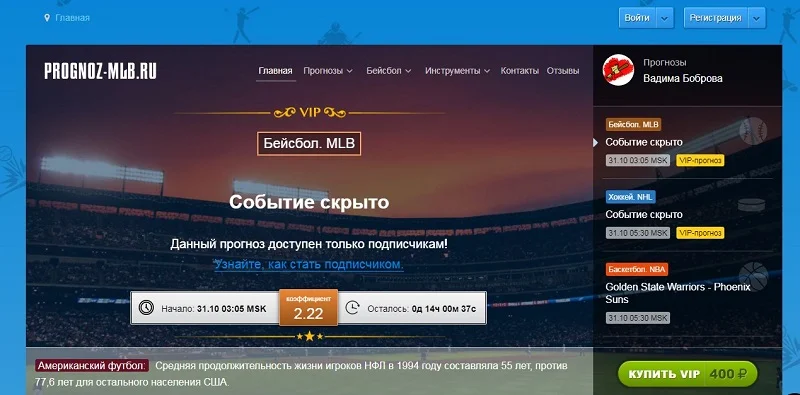 Проект работает через собственный сайт, а также ведет страницы в социальных сетях. Бейсбольная лига MLB – основное направление каппера. В межсезонье сервис предлагает платные и бесплатные прогнозы на поединки NBA и NHL.