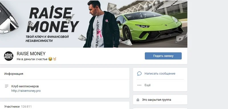 Группа Raise Money в социальной сети Вконтакте собрала 127 тысяч подписчиков, но есть все основания полагать, что имело место быть искусственное привлечение пользователей. Сообщество закрыто для прямого посещения. Войти в него можно только одобрения администратором.