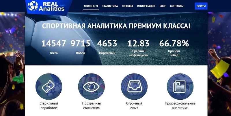 Real Analitics – капперский сайт, специализирующийся на спортивных ставках. Основателем проекта является Артем Сущенко, запустивший сервис в работу в 2015 году.