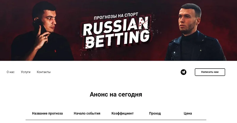 Russian Betting предлагает игрокам купить ординарные и экспресс прогнозы на спорт. Бесплатных предложений у этого каппера нет. Сервис заявляет высокую проходимость своих ставок, которая в среднем составляет 80% с диапазоном коэффициентов 1.80 – 2.00.